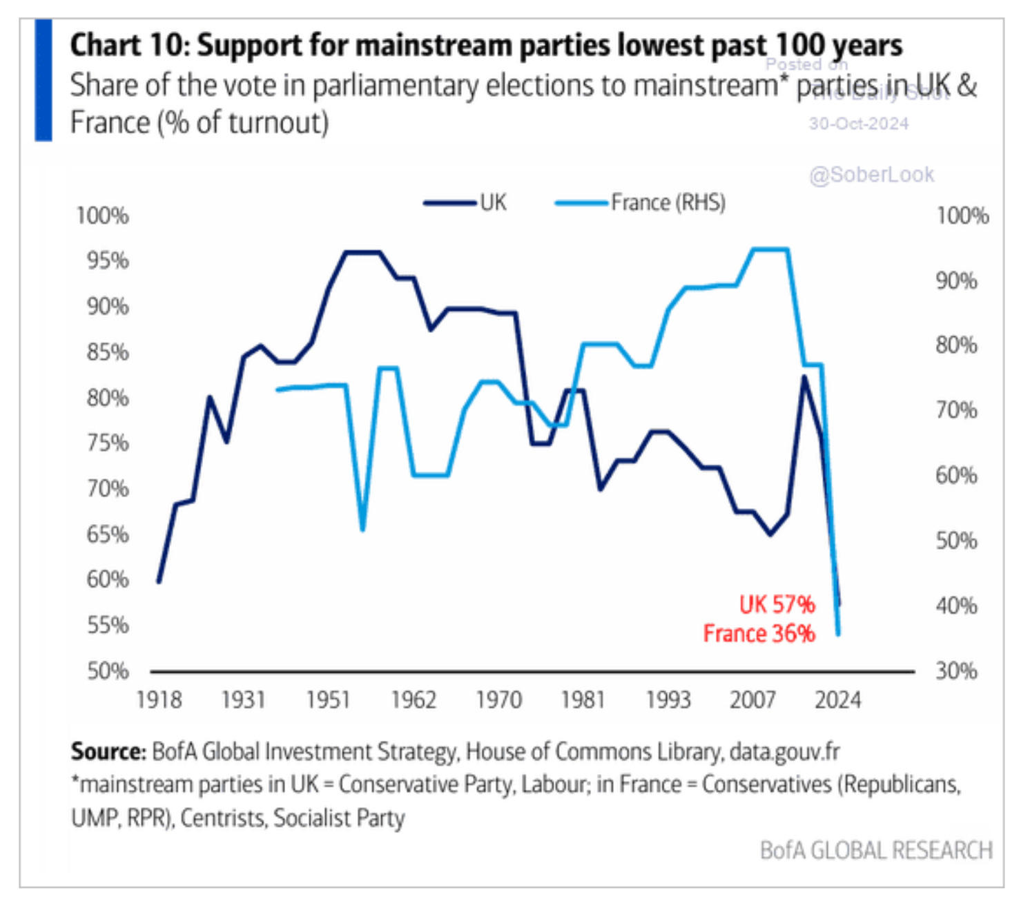 I Tyskland og Frankrig samt i store områder af Østeuropa repræsenterer disse politiske strømninger nu en så stor del af befolkningen, at de traditionelle midterpartier enten helt har mistet indflydelse, som det er sket for Socialisterne i Frankrig, eller at de går markant tilbage, som det er sket for De Grønne og for Socialdemokraterne i Tyskland. Ingen af disse traditionelt EU-venlige midterpartier vil i det aktuelle politiske klima kunne forventes at stille sig bag en yderligere dybtgående uddybning af EU-samarbejdet samt optagelse af statslån for milliarder af euro for at finansiere et storstilet investeringsprogram, der et langt stykke af vejen vil indebære en overførsel af enorme summer fra de offentlige kasser til ejerne af private virksomheder.