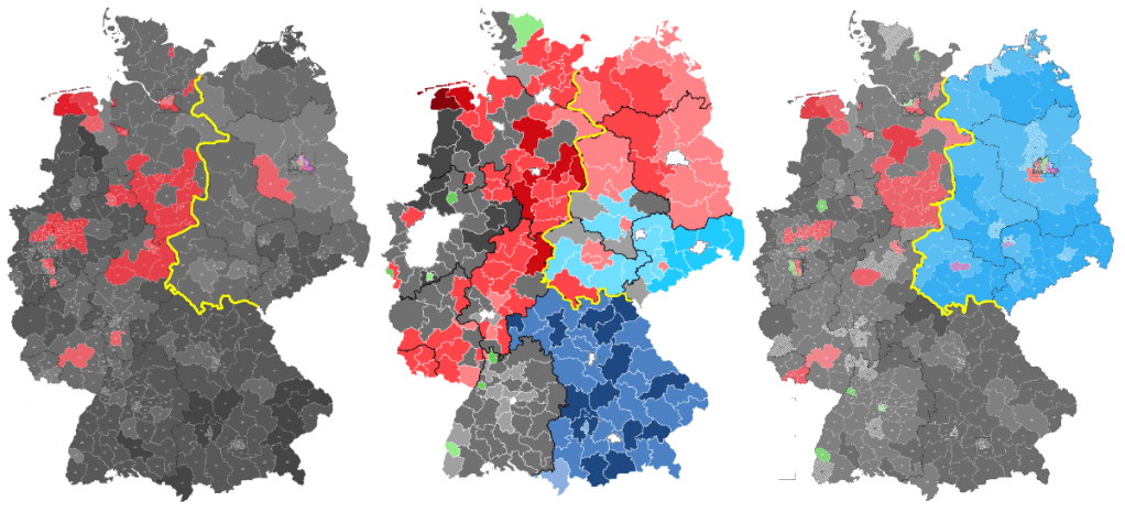 Ved afstemningen den 23. februar 2025 fik Alternative für Deutschland (AfD) mindst 15 % af stemmerne i de fleste valgkredse i hele landet. I store dele af det tidligere DDR steg dette til over 30 % og så højt som 47 % i Görlitz.